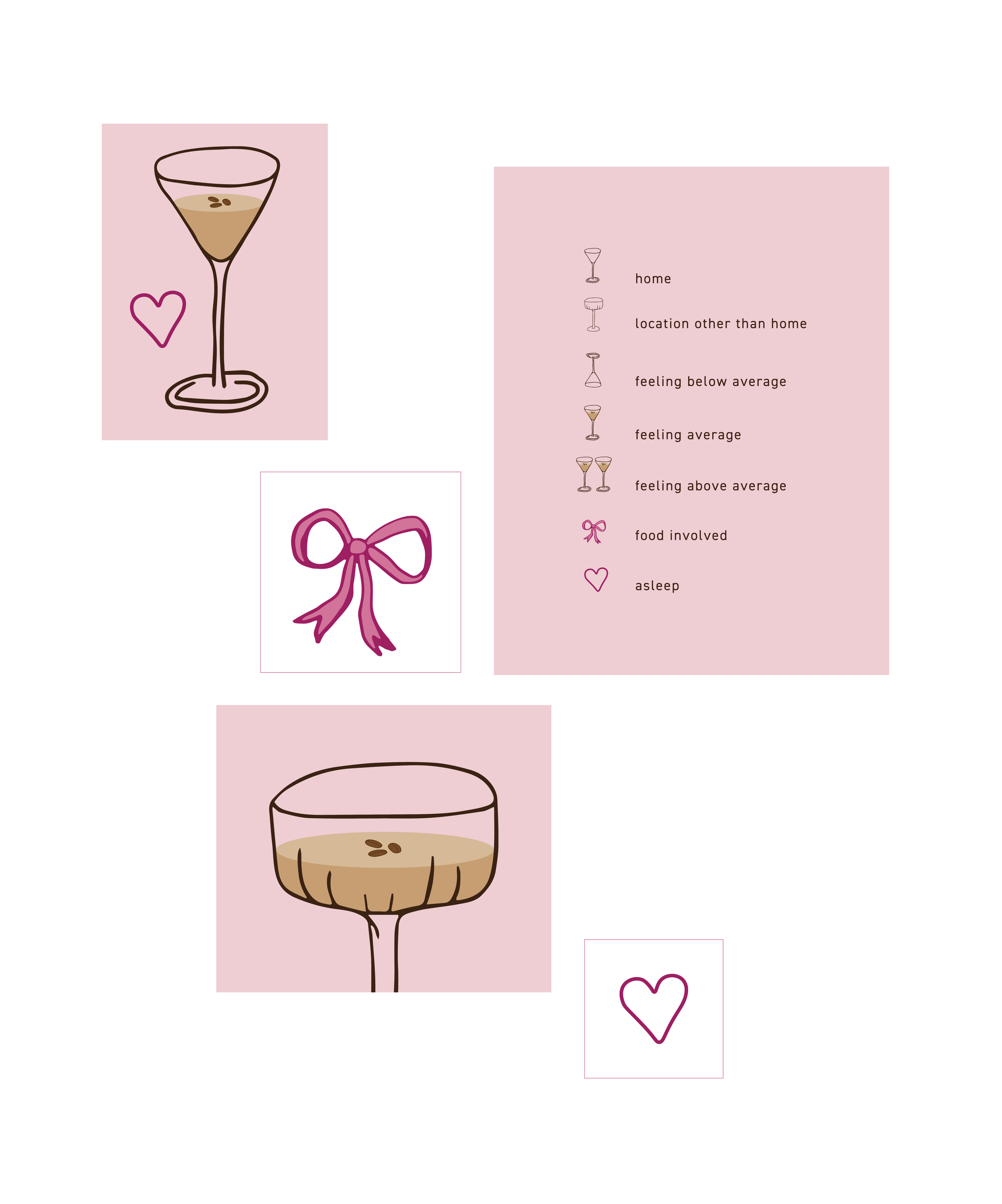 This is a timeline project that begin by recording what happened every 15 minutes of a day for 10 hours. I then took what happened in my day and assigned icons based on factors like how I was feeling and what I was doing. Each 15 represents a different espresso martini based on what was occurring.